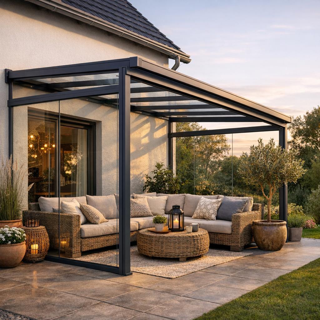- Eine robuste Terrassenüberdachung mit seitlichen Windschutzsystemen und flexiblen Sonnenschutzelementen bietet effektiven Schutz und erhöht den Komfort bei schlechtem Wetter.